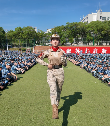 9月17日上午,郝茹婧来到新生军训场,为新生示范标准正步动作,并与同学们合影留念。