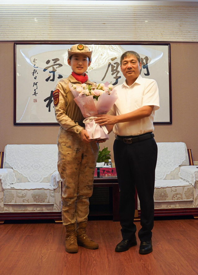 校党委副书记、校长罗仙平亲切会见郝茹婧,对她返回母校表示欢迎,对她在阅兵中的出色表现给予高度赞扬,并鼓励她继续保持昂扬的斗志,在人生旅途上再创佳绩,为校争光。