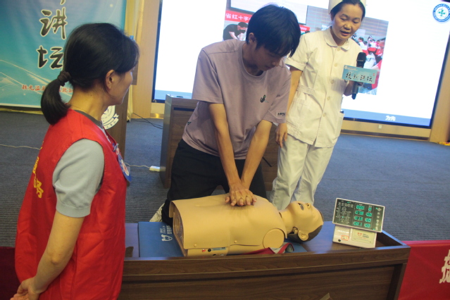 黄茶英围绕艾滋病传播机制、科学预防策略及常见认知误区等内容展开系统阐述,重点讲解了艾滋病暴露应急处理与伤口规范处置流程。在实践操作环节,医护人员现场演示了心肺复苏的完整流程,并邀请学生上台参与模拟练习,帮助师生将抽象的理论知识转化为直观、可操作的实践技能。