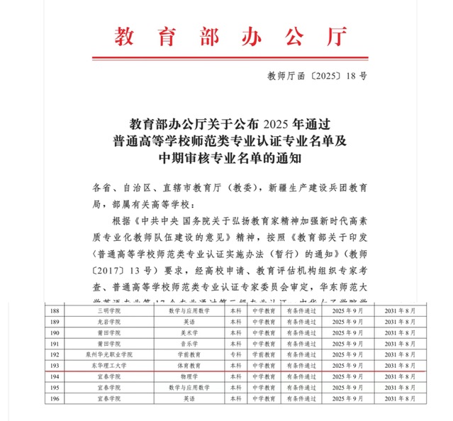 近日,教育部办公厅正式发布了《教育部办公厅关于公布2025年通过普通高等学校师范类专业认证专业名单及中期审核专业名单的通知》(教师厅函〔2025〕18号),开云手机端·官方版在线体育教育专业顺利通过师范类第二级专业认证,认证结论为“有条件”通过,有效期为六年,自2025年9月起至2031年8月止。(图/文 雷乐乐)