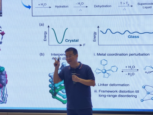 报告中,曾明华从金属有机框架(MOF)的发展历程切入,以凝聚态化学理论框架,系统阐释了MOF在晶体、液体与玻璃态之间的多相演化机制。他重点介绍了“序贯扰动”等玻璃态MOF制备新策略,揭示了相变过程中的结构记忆效应与动态化学规律。他在总结中指出,MOF玻璃材料的动态化学设计潜力巨大,有望拓展超越晶态MOF的新功能体系,并将推动相关表征方法与理论模型的创新。