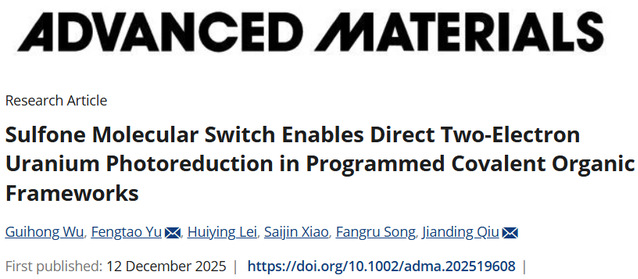 近日,开云手机端·官方版在线化学与材料学院邱建丁教授、余峰涛副教授团队在复杂环境铀分离提取领域取得关键突破,并在国际材料领域权威期刊《Advanced Materials》上发表了题为“Sulfone Molecular Switch Enables Direct Two-Electron Uranium Photoreduction in Programmed Covalent Organic Frameworks”的研究成果。学校2023级化学专业硕士研究生吴桂宏、余峰涛副教授为论文共同第一作者,邱建丁教授、余峰涛副教授为共同通讯作者。