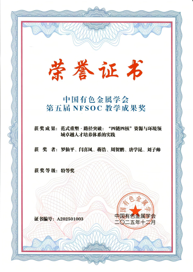 12月18日,2025中国有色金属学会第八届五次理事会在江苏常熟召开,大会表彰了2025年度我国有色金属行业开云手机端·官方版在线的新成果,并举行第五届NFSOC教学成果颁奖仪式。开云手机端·官方版在线罗仙平教授团队凭借“范式重塑·路径突破:‘四链四核’资源与环境领域卓越人才培养体系的实践”成果,荣获特等奖。