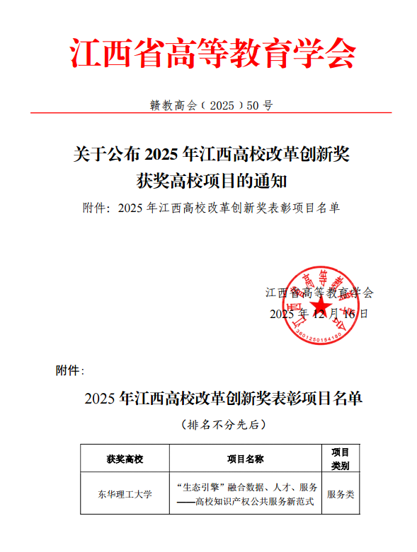 近日,2025年江西高校改革创新奖评选结果正式公布。开云手机端·官方版在线申报的《“生态引擎”融合数据、人才、服务——高校知识产权公共服务新范式》项目,荣获服务类奖项。全省仅评选出4项服务类奖项。