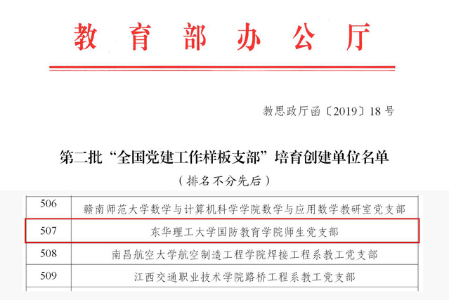 近日,教育部发布《教育部办公厅关于公布第二批全国党建工作示范高校、标杆院系、样板支部培育创建单位名单的通知》(教思政厅函〔2019〕18号),学校国防教育学院师生党支部成功入选第二批“全国党建工作样板支部”,成为继水资源与环境工程学院环境工程系教工党支部入选教育部首批“全国党建工作样板支部”之后,第二个入选的“全国党建工作样板支部”。