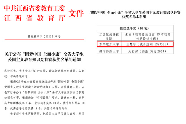 近日,中共江西省委教育工委、江西省教育厅公布了“圆梦中国 全面小康”全省大学生爱国主义教育知识竞答赛获奖名单,我校地球科学学院汪慧琴同学荣获本科组最佳选手奖,全省仅有10位同学获此奖项。