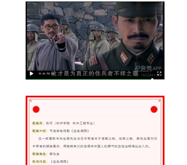 “你们日本,侵我家园,杀我同胞。我中华奋起抗争,这才是真正的平蛮攘夷,这才是为真正的佳兵者不祥之器,圣人不得已而用之的道理!”这是软件学院张可同学通过配音秀app录制的一段慷慨激昂的影视片段。观看了电视剧《血色湘西》中教书先生瞿先生在就义前与日本军官的侵略之辩,张可深受感触,便报名参加“红色作业”之红色影视配音秀活动。“这部电视剧讲述了在共产党员童莲的组织领导下,湘西抗日军民誓死捍卫家园的悲壮故事。瞿先生这段铿锵有力的话语将中国人的凛然血性和铮铮铁骨诠释得淋漓尽致。也让我在配音过程中追忆党史故事,感悟时代之音,汲取精神力量!”