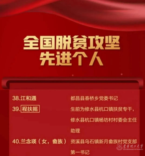 程扶摇在响应党和国家的号召之时,以满腔热情投入到脱贫工作中,数次面临灾难,仍然发扬东华理工人的核军工精神。用他年轻、辉煌的人生在这场脱贫攻坚战写下了浓墨重彩的一笔。