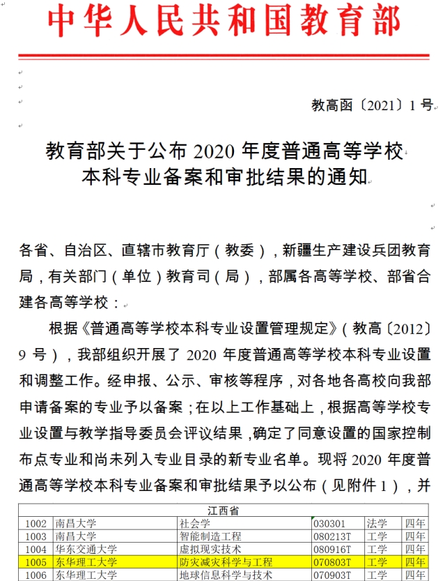 近日,由我校申报的“防灾减灾科学与工程”本科专业通过教育部审批,列入了《普通高等学校本科专业目录(2021年版)》,成为江西省首个获批“防灾减灾科学与工程”的本科专业。