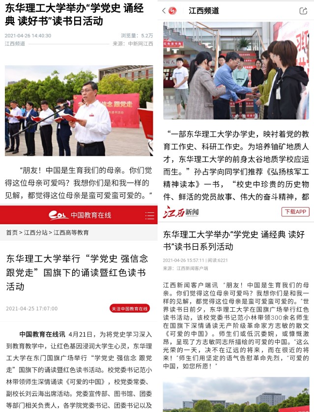 编者按:在世界读书日期间,学校把党史学习教育融入全民阅读,校党委书记、校长纷纷带头“打样”,组织开展一系列丰富多彩的红色主题阅读活动,引导广大师生学党史、诵经典、读好书,营造了全民阅读学党史的浓厚氛围,进一步提升了全校师生的爱党爱国情怀。新华社、中新网、中国教育在线、凤凰网、江西新闻客户端等媒体对此进行报道,现将内容转载如下: