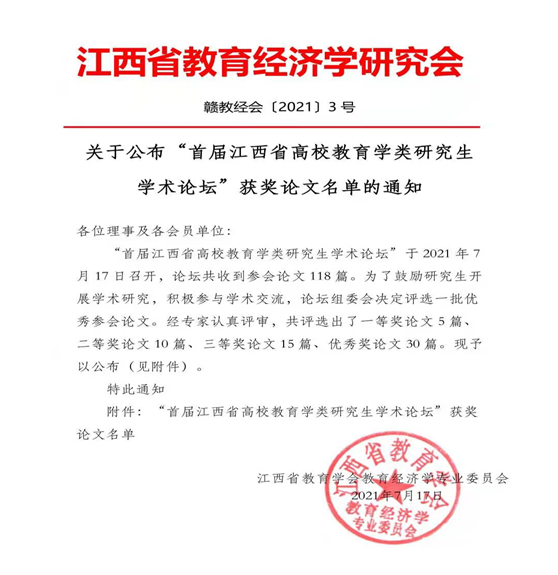 7月17日,由江西省教育经济学研究会组织的首届江西省高校教育学类研究生学术论坛顺利召开,我校教育硕士学位研究生共提交参会论文9篇,有3人次获评优秀参会论文,其中,二等奖1人,三等奖1人,优秀奖1人。教育管理方向的研究生贾文丽同时获邀在论坛上进行主题发言,展示了我校教育硕士学位研究生的专业素养和科研潜力。