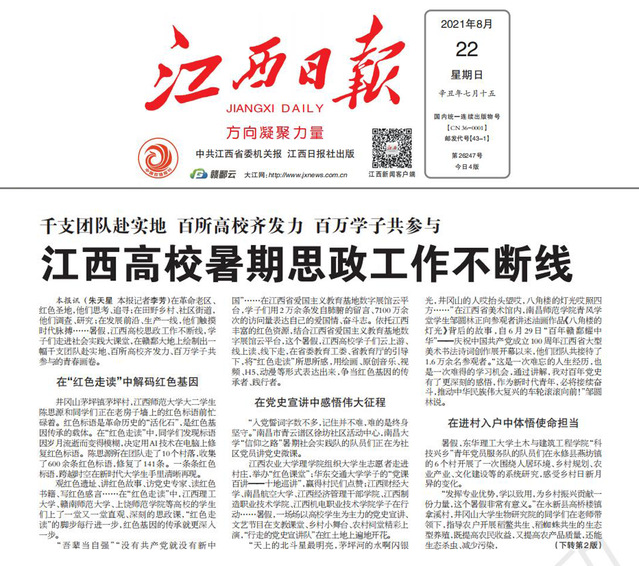 编者按:8月22日,江西日报头版头条刊登《千支团队赴实地 百所高校齐发力 百万学子共参与 江西高校暑期思政工作不断线》,其中介绍了我校土木与建筑工程学院“科技兴乡”青年党员服务队围绕人居环境、乡村规划、农业产业、文化建设等方面内容助力乡村振兴、开展暑期思政工作情况,学习强国、人民网、中国青年网、中国日报网、江西省人民政府官网、问政江西平台、中国江西网、江西新闻客户端等媒体平台纷纷转载刊发,引起社会广泛关注。现将报道原文转载如下: