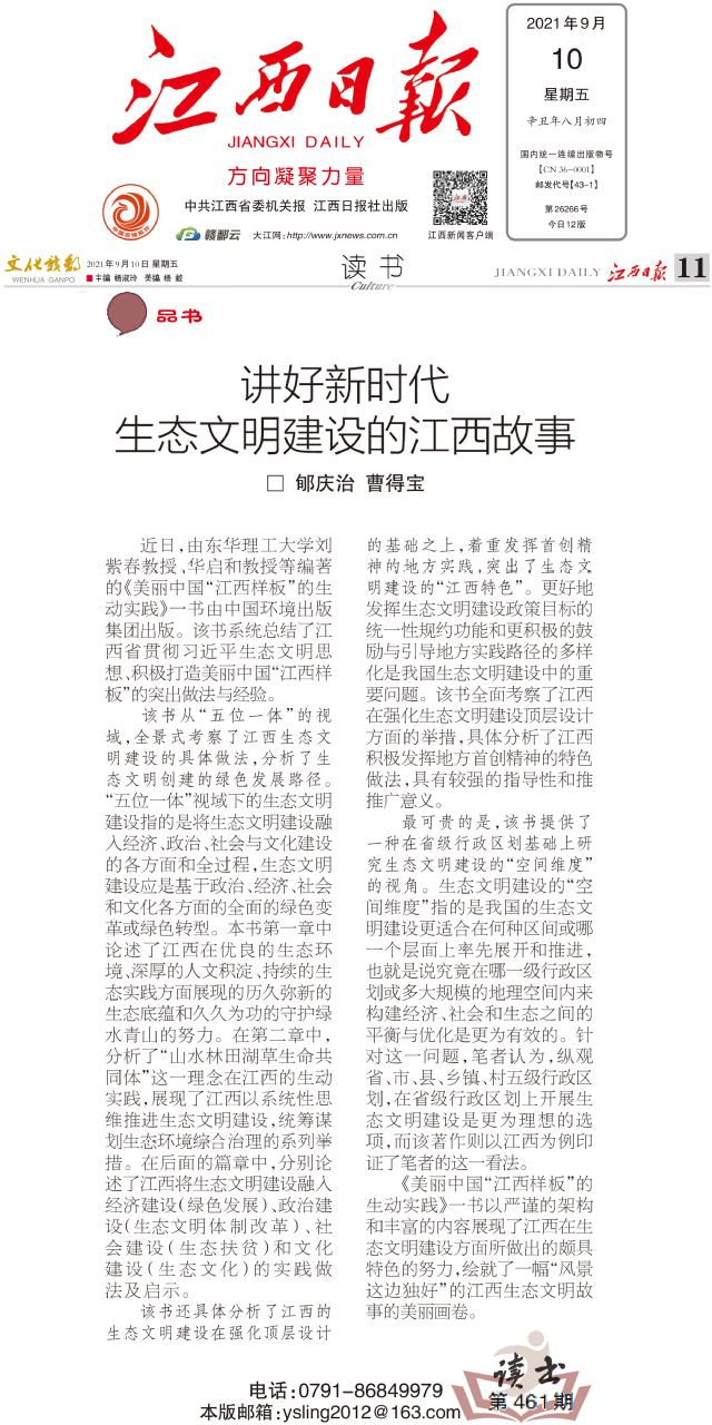 编者按:近日,由开云手机端·官方版在线刘紫春教授、华启和教授等编著的《美丽中国“江西样板”的生动实践》一书由中国环境出版集团出版。该书系统总结了江西省贯彻习近平生态文明思想、积极打造美丽中国“江西样板”的突出做法与经验。北京大学教授、著名生态文明研究专家郇庆治,博士曹得宝以“讲好新时代生态文明建设的江西故事”为题进行书评,江西日报对此进行报道,现将相关内容转载如下: