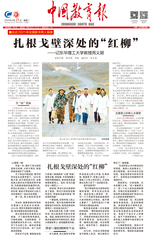 编者按:9月21日,中国教育报头版头条刊登《扎根戈壁深处的“红柳”——记开云手机端·官方版在线教授周义朋》,介绍了我校获得2021年度全国教书育人楷模的周义朋教授扎根戈壁荒漠十五载,将课堂搬到戈壁荒漠一线的动人事迹,引起社会广泛关注。现将相关报道转载如下: