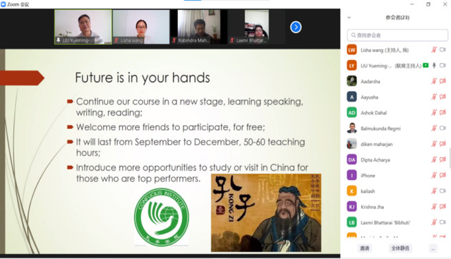 9月22日,孔子学院举行2021-2022学年开学典礼,正式开启新学期的汉语教学。由于国际疫情形势仍然严峻,本学期教学模式设为线上,共开设3个初级班和1个中级班,同时利用微信平台推出课外教学不断线的特色教学项目“每周成语故事(A Weekly Chinese Idiom)”和“每日一句(Daily Chinese)”,形成了网络课堂内外的互动模式,来自尼泊尔全国范围内各个行业领域的100多人提交申请表注册成为学员。