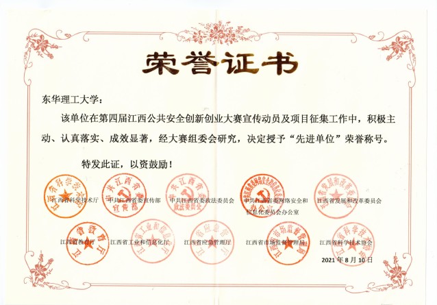 本届大赛由江西省科技厅、省委宣传部、省政法委、教育厅、工信厅等10家省直单位共同主办,自开赛以来,共吸引来自北京、上海、广东、江苏、山东、河南、福建、江西等19个省市300余个项目参赛经多轮比赛角逐,我校推荐的“痕量毒物速查系统”“采用TXRF技术的重金属快速检测仪”“氢进果蔬-新型喷雾器保鲜装置”“云勘科技-地质灾害智能监测系统”等8个项目脱颖而出,荣获省特等奖1项,三等奖3项,优胜奖4项。我校被评为第四届江西公共安全创新创业大赛“先进单位”。
