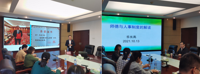 全国教书育人楷模周义朋教授以“教育报国,情怀育人”为主题,分享了他扎根新疆戈壁荒滩十五载的心路历程。周义朋的感人事迹体现了他对工作始终不渝的热爱,对教育事业的执着追求,表现出其崇高的师德风范。党委教师工作部、人事处负责人以“师德与人事制度”为主题,介绍了人事相关制度和政策,并从教师职业选择、职业精神、职业规划三个方面进行阐述,强调了师德师风是教师队伍建设的首要标准。