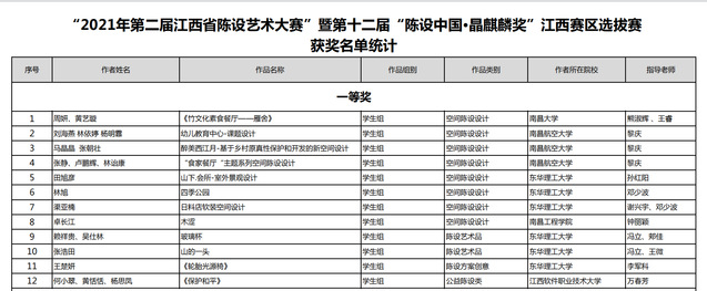 10月19日,由“陈设中国·晶麒麟”组委会、江西陈设艺术大赛组委会主办,我校艺术学院、文昌里创新研究院、江西省室内装饰协会陈设艺术专业委员会承办的“2021年第二届江西省陈设艺术大赛”暨第十二届“陈设中国·晶麒麟奖”江西赛区选拔赛评审工作在我校枫林校区艺术学院创新创业实践教学基地圆满完成。我校师生在此次大赛中喜获佳绩,其中我校报送的作品《山下·会所——室外景观设计》《四季公园》《日料店软装空间设计》《玻璃杯》《山的一头》《《轮胎光源椅》》荣获一等奖,各组别获二等奖、三等奖若干。