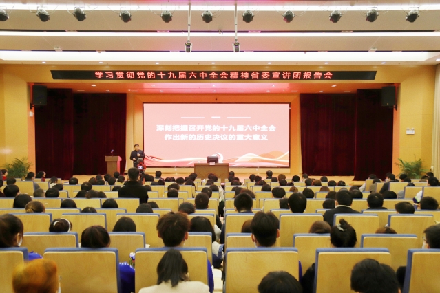 孙占学在主持中指出,宣讲报告主题鲜明、视野开阔、案例生动、数据翔实、阐释深刻,为我们深入学习贯彻、全面准确把握党的十九届六中全会精神和省第十五次党代会精神给予了强有力的指导。全校上下要切实从党的百年奋斗重大成就和历史经验中汲取智慧和力量,进一步增强“四个意识”、坚定“四个自信”、做到“两个维护”,更加坚定自觉地践行初心使命,埋头苦干、勇毅前行,落实立德树人根本任务,办好人民满意教育。
