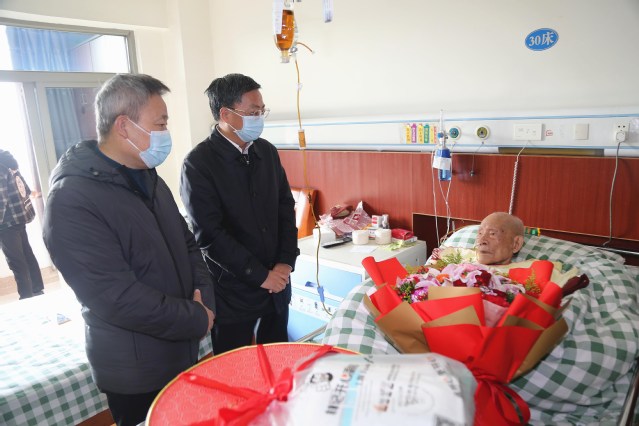 12月15日,校长孙占学、校党委副书记刘紫春在有关部门负责人陪同下来到抚州市第一人民医院,为我校首位百岁老人、抗战离休干部、老党员吉波祝寿,送上学校领导的关心、党组织的温暖以及百岁生日的美好祝福。