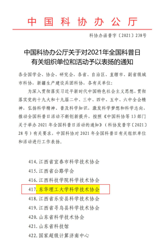 近日,中国科协办公厅发文,对2021年全国科普日有关组织单位和活动予以表扬,我校科协获评“优秀组织单位”(全省唯一)。