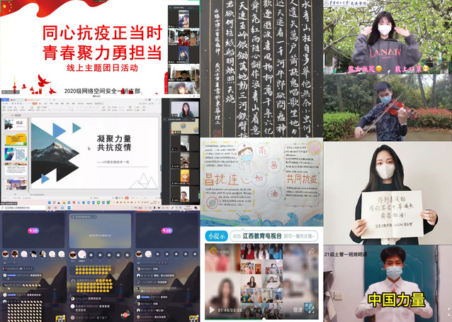 主题活动,线上赋能。结合我校实际情况,为进一步增强广大青年学生疫情防控意识,校团委积极组织全校各支部持续开展“同心防疫正当时,青春聚力勇担当”线上主题团日活动,各学院团委凝练学院特色,以主题团课、抗疫微宣讲、以“艺”抗疫云才艺展示为防疫“宅生活”充电赋能。理学院结合青春战疫故事的内容开展“青年有话说”感悟分享交流会;信息工程学院、软件学院开展“昌抚同心,共克时艰”云端主题活动;文法学院、测绘工程学院录制防疫手势舞助力疫情防控、地球物理与测控技术学院开展线上音乐会……各学院充分发挥团员青年特长,通过创作书法、绘画、手抄报、网文、微视频等形式多样的文化作品,科普抗疫知识、宣传抗疫政策。同时,积极开展“绽放防疫青春•宿舍(支部)风采有我”“团支书防疫知识小讲堂”等线上文体活动,营造了主题鲜明、健康向上、丰富多彩的校园文化氛围。