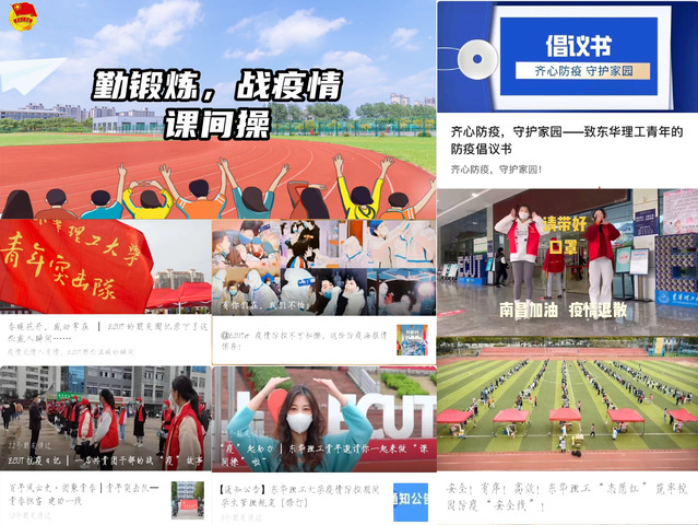 暖心宣传,助力防疫。“不要贴贴,不要贴贴,贴贴危险,还是密接” “不点外卖,病毒进校无门,不带口罩,遍地危机四伏”“预防千万条,口罩第一条”等时下流行防疫宣传标语在校园内随处可见,内容好记又温暖人心。这些条幅标语把疫情防控的基本常识融入其中,时时提醒师生积极配合学校防控要求。校团委以“东华理工青年”和“开云手机端·官方版在线学生会”等新媒体平台为宣传阵地,挖掘和宣传我校在疫情防控阻击战中涌现的先进个人和典型事迹,讲好青春防疫故事,弘扬和发挥我校青年疫情防控网络正能量,不断传递疫情防控“最强音”,让防疫宣传“声”入人心,目前累计共推出疫情防控推文21篇,防疫视频4个。
