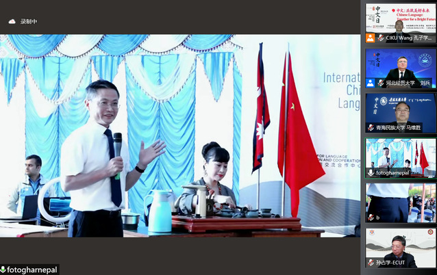 4月20日是联合国第13个中文日,中国驻尼泊尔大使馆、河北经贸大学加德满都大学孔子学院、我校特里布文大学孔子学院以“中文:共筑美好未来”为主题联合举办尼泊尔2022年“联合国中文日”活动。中国驻尼泊尔大使侯艳琪、尼教育与科技部长迪潘德拉·鲍德尔等出席,校长孙占学应邀参加本次活动。