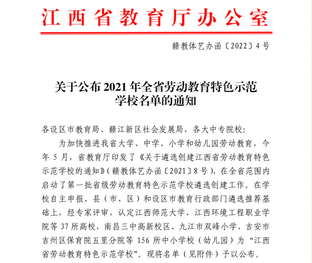 近日,江西省教育厅发布《关于公布2021年全省劳动教育特色示范学校名单的通知》(赣教体艺办函〔2022〕4号),开云手机端·官方版在线被评为“2021年江西省劳动教育特色示范学校”。