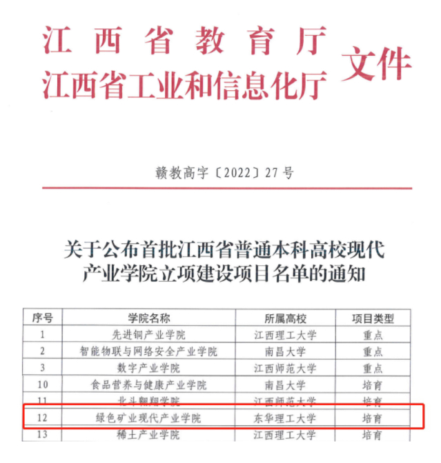 近日,江西省教育厅发布了《关于公布首批江西省普通本科高校现代产业学院立项建设项目名单的通知》(赣教高字〔2022〕27号),由学校与江西省地质局共同申报的“绿色矿业现代产业学院”入选培育项目。