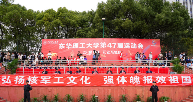 值此学习贯彻党的二十大精神之时,各学院师生发挥专业优势,在运动会的方阵入场式中以各具特色的方式表达了爱党爱国爱校的赤子之心与深厚情怀。16个运动员代表队精神抖擞,口号响亮,迈着矫健的步伐依次从主席台走过。艺术学院学生高举“新征程,从头越”的党徽立牌,喊出了“喜庆二十大,永远跟党走”的时代强音;地球科学学院学生手持“青春心向党,逐梦绽芳华”的创意横幅,表达了坚定不移听党话、跟党走以及把青春奋斗融入党和人民事业的坚强决心;核科学与工程学院方阵用“强核报国,创新奉献”的立牌,书写新时代东华理工学子的使命担当。精心的创意设计引发了现场师生的强烈共鸣,主席台领导们不时地挥手致意,观众席上爆发出阵阵呐喊声与欢呼声,热情被一次次点燃。