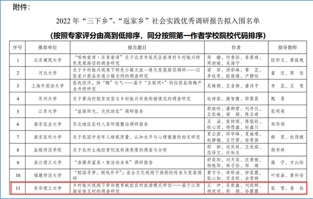 为深入学习贯彻习近平总书记关于青年工作的重要思想,共青团中央青年发展部于今年7月推出“2022年‘三下乡’‘返家乡’社会实践调研报告”征集活动。近日,活动结果公布,由我校学生撰写的《乡村振兴视阈下劳动教育赋能农村旅游模式研究——基于江西高安徐王村的调查研究》调研报告,以江西省高校排名第一、全国高校排名第十一的成绩成功入选社会实践优秀调研报告。