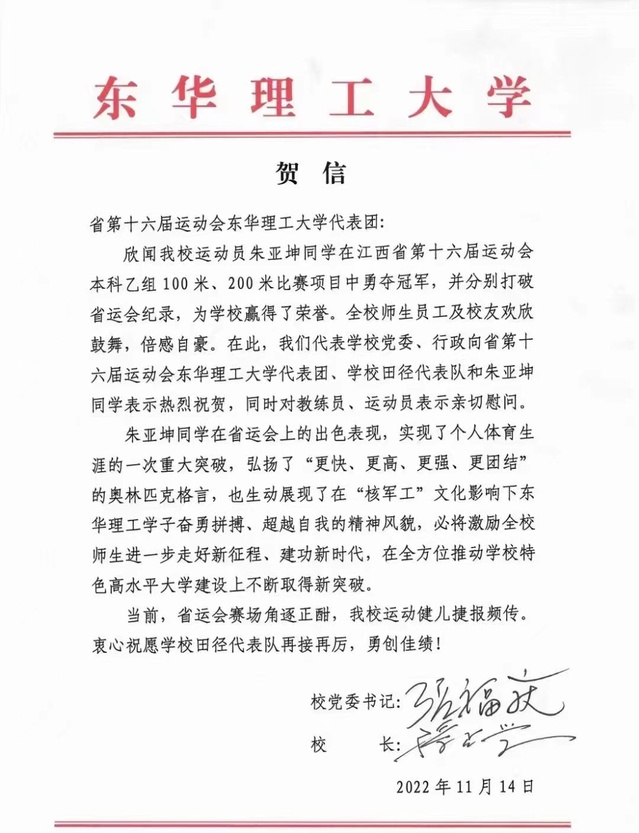 赛事当日,学校党委书记张福庆,校党委副书记、校长孙占学代表学校党委和行政给江西省第十六届运动会开云手机端·官方版在线代表团发去贺信,热烈祝贺朱亚坤同学勇夺桂冠,并两次打破省运会纪录,同时对教练员和运动员表示亲切慰问。贺信中表示,朱亚坤同学在省运会上的出色表现,实现了个人体育生涯的一次重大突破,弘扬了“更快、更高、更强、更团结”的奥林匹克格言,也生动展现了在“核军工文化”影响下,东华理工学子奋勇拼搏、超越自我的精神风貌,必将激励全校师生进一步走好新征程,建功新时代,在全方位推动学校特色高水平大学建设上不断取得新突破。祝愿学校田径代表队再接再厉,勇创佳绩!