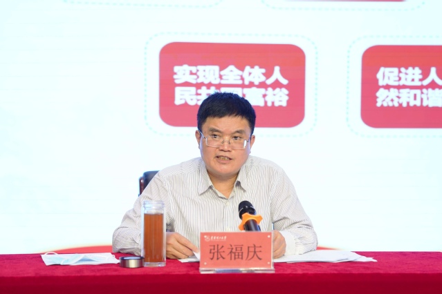 张福庆从深刻领会和准确把握党的二十大的主题和主要成果、过去5年的工作和新时代10年的伟大变革、马克思主义中国化时代化的新境界、以中国式现代化全面推进中华民族伟大复兴、全面建设社会主义现代化国家的目标任务、坚持党的全面领导和全面从严治党的重大部署、团结奋斗的时代要求等七个方面,对党的二十大精神进行全面解读,对党的二十大提出的新观点、新论断、新思想进行深入阐释。