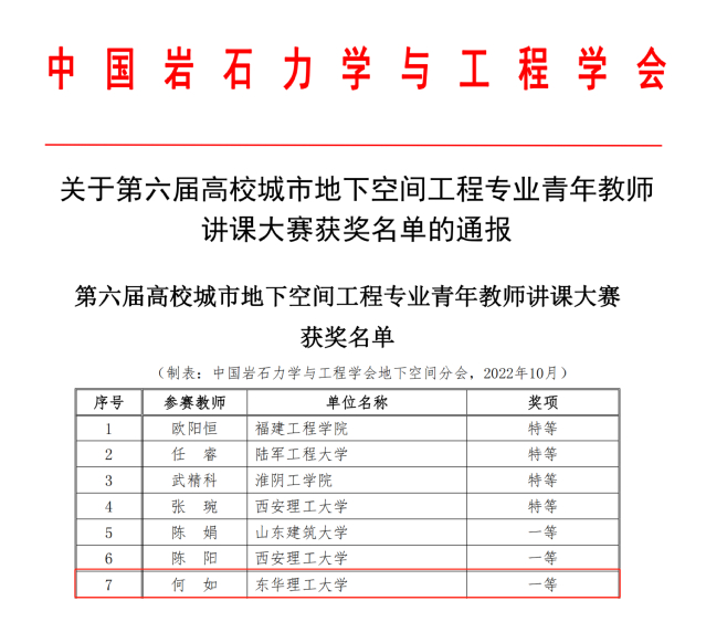据悉,来自全国33所高校的49位城市地下空间工程专业青年教师参加了本次大赛。经过激烈角逐,我校土木与建筑工程学院教师何如博士荣获一等奖。竞赛中,何如博士结合工程实例及党的二十大精神,注重教学情境设计,深入浅出地讲解知识要点,以丰富翔实的教学内容和丰富多彩的授课方式,充分展现了我校青年教师的专业水平和教学风采。这也是该专业教师继获第三届高校城市地下空间工程专业青年教师讲课大赛一等奖后,再获殊荣。