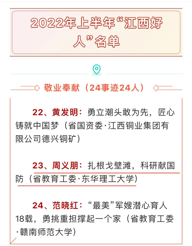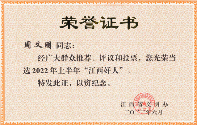 7月7日下午,全省道德模范与“身边好人”现场交流活动暨2022年上半年“江西好人”发布仪式在南昌隆重举行。活动揭晓了2022年上半年“江西好人”名单,我校周义朋教授荣获2022年上半年“江西好人”称号。