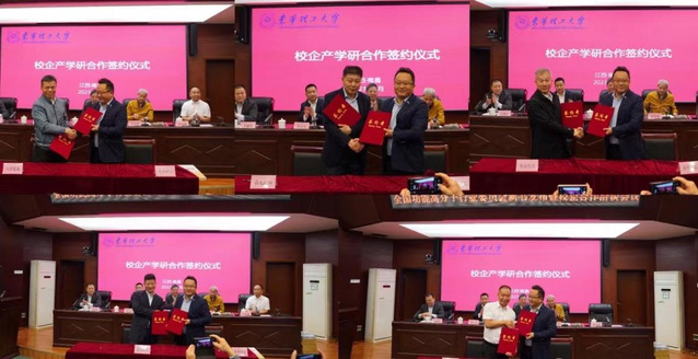 化学生物与材料科学学院负责人代表学校分别与江苏富淼科技股份有限公司、江苏昌九农科化工有限公司、宁波先安化工有限公司、江西富诚生态环境科技集团有限公司以及焦作市宏达力生物化工有限公司等签署了校企合作协议。