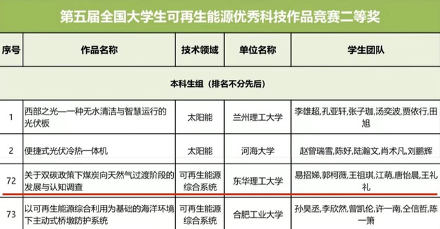 近日,第五届全国大学生可再生能源优秀科技作品竞赛圆满结束,我校参赛作品荣获二等奖1项、三等奖3项。获奖作品涵盖生物、地热和太阳能等多个研究方向,充分展现了我校学子在可再生能源领域的科研实力。