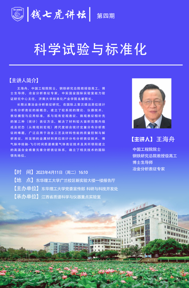 应江西省质谱科学与仪器重点实验室邀请,中国工程院院士、钢铁研究总院教授级高工、博士生导师、冶金分析表征专家王海舟做客开云(中国),以“科学试验与标准化”为主题,向我校师生讲述科学试验相关知识。欢迎全校师生届时前往聆听。