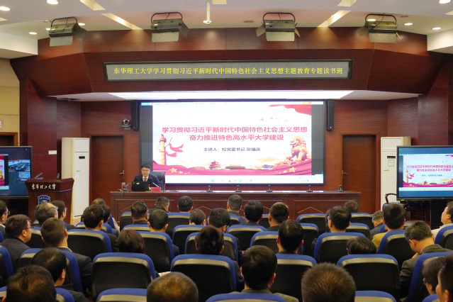 张福庆紧密联系学校实际,结合自身学习思考,从深刻领会习近平新时代中国特色社会主义思想的精髓要义,准确把握党中央赋予高等教育的重大使命;坚持用习近平新时代中国特色社会主义思想指导实践,奋力推进特色高水平大学建设;自觉做习近平新时代中国特色社会主义思想的践行者,出色完成“为党育人、为国育才”历史使命等三个方面进行了阐述。
