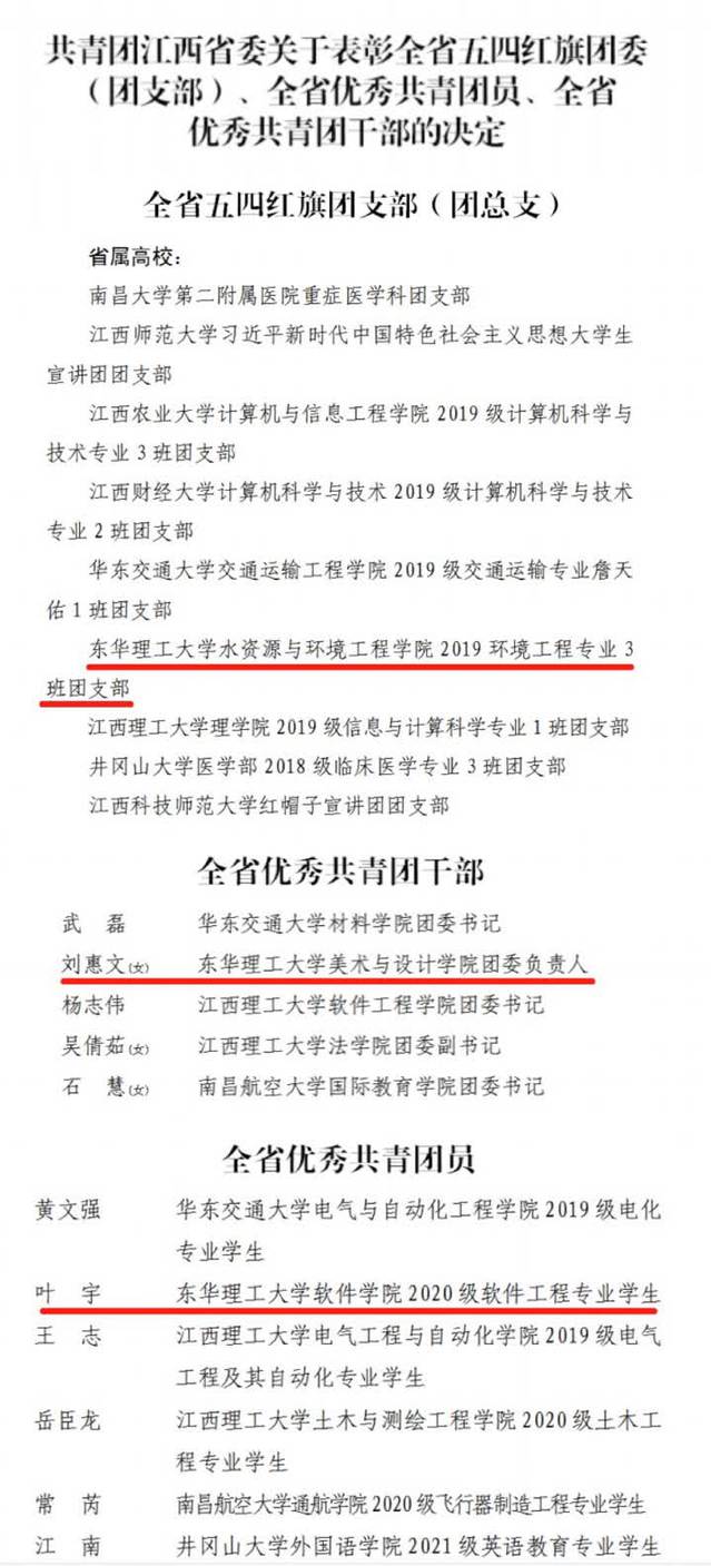 近日,共青团江西省委印发了《共青团江西省委关于表彰全省五四红旗团委(团支部)、全省优秀共青团员、全省优秀共青团干部的决定》(赣青发〔2023〕6号),对2022年度全省共青团先进典型进行表彰,开云手机端·官方版在线水资源与环境工程学院2019环境工程专业3班团支部获2022年度“全省五四红旗团支部”称号;美术与设计学院刘惠文老师获“全省优秀共青团干部”称号;软件学院叶宇同学获“全省优秀共青团员”称号。