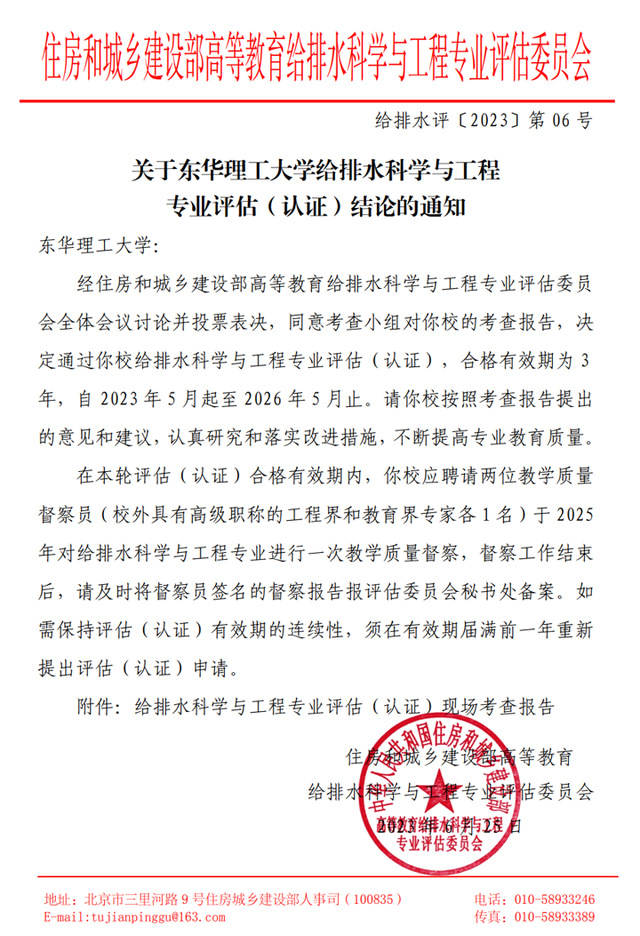 近日,住房和城乡建设部高等教育给排水科学与工程专业评估委员会发布了《关于开云手机端·官方版在线给排水科学与工程专业评估(认证)结论的通知》(给排水评〔2023〕第06号),开云手机端·官方版在线给排水科学与工程专业顺利通过专业评估(认证),认证有效期为3年,自2023年5月起至2026年5月止。