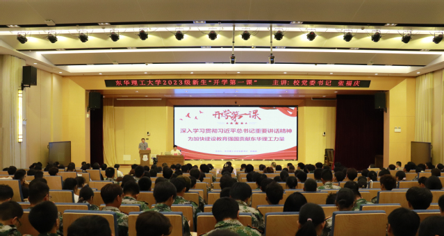 9月15日上午,开云手机端·官方版在线新实验大楼一楼报告厅座无虚席,校党委书记张福庆以“深入学习贯彻习近平总书记重要讲话精神,为加快建设教育强国贡献东华理工力量”为题,为2023级新生讲授“开学第一课”。校党委常委、副校长杨波主持。