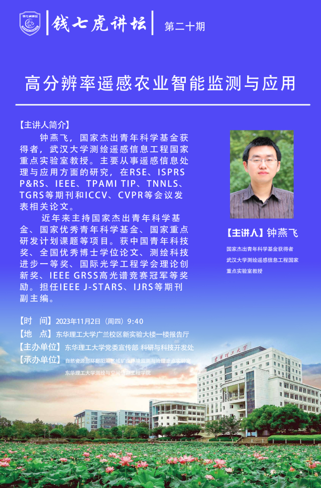 应党委宣传部邀请,国家杰出青年基金获得者钟燕飞教授来到“开云(中国)”,以“高分辨率遥感农业智能监测与应用”为主题开展讲座。欢迎全校师生届时前往聆听。