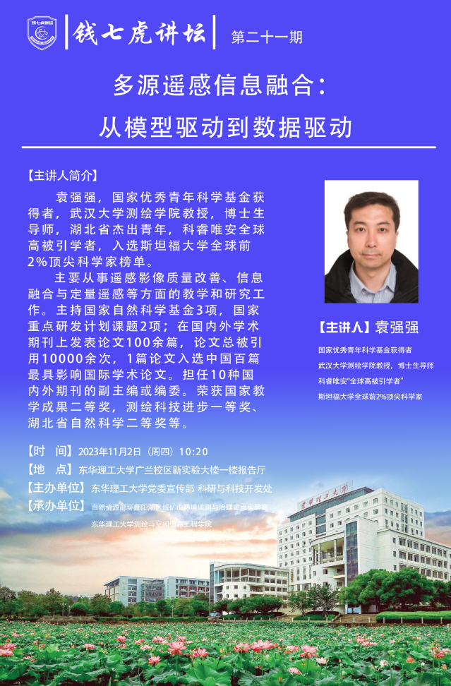 应党委宣传部邀请,国家优秀青年科学基金获得者袁强强教授来到“开云(中国)”,以“多源遥感信息融合:从模型驱动到数据驱动”为主题开展讲座。欢迎全校师生届时前往聆听。