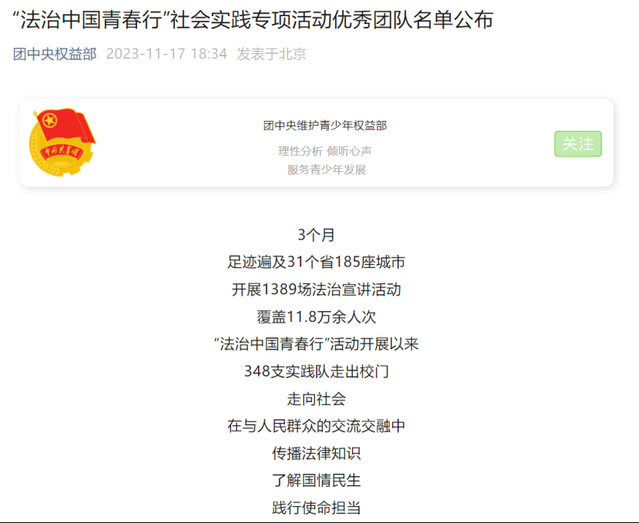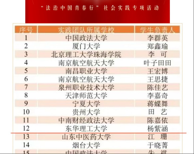 据悉,“法治中国青春行”社会实践专项活动是由团中央维护青少年权益部主办的暑期社会实践活动。此次活动遍及全国31个省185座城市,348支来自各大高校的实践团队共同参与,累计开展1389场法治宣讲活动。根据各实践团队活动期间的表现和最终成果,最终评选出了50支优秀团队。(文/许文吉 高雪妍 图/高雪妍)