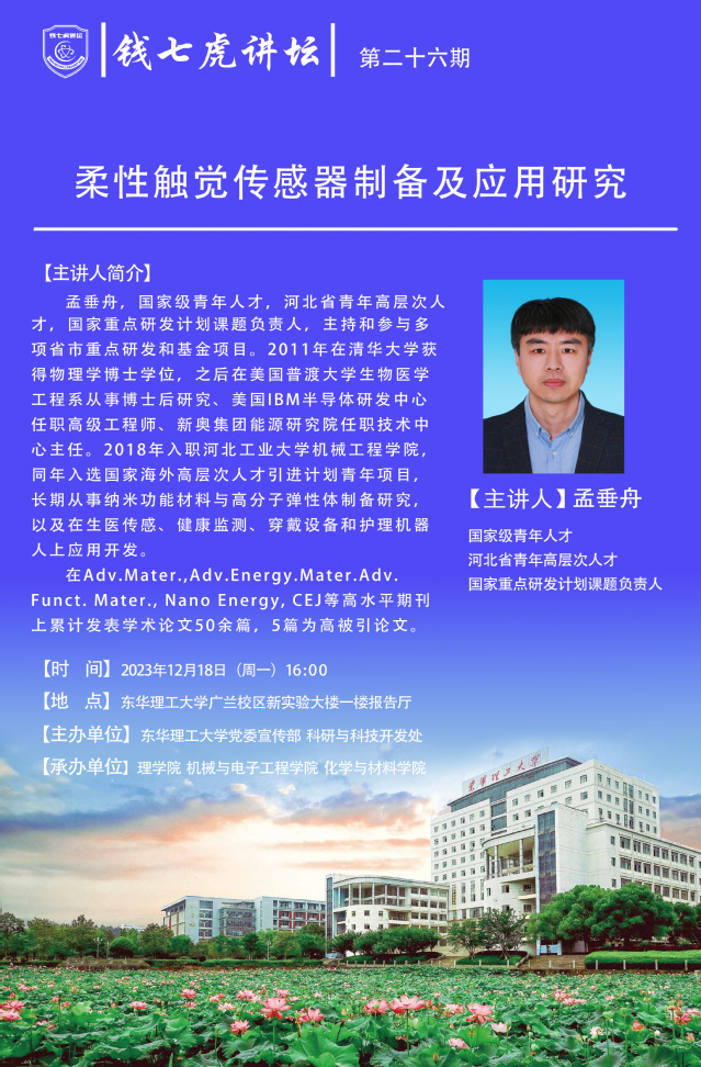 应理学院邀请,国家级青年人才孟垂舟教授来到“开云(中国)”,以“柔性触觉传感器制备及应用研究”为主题开展讲座。欢迎全校师生届时前往聆听。
