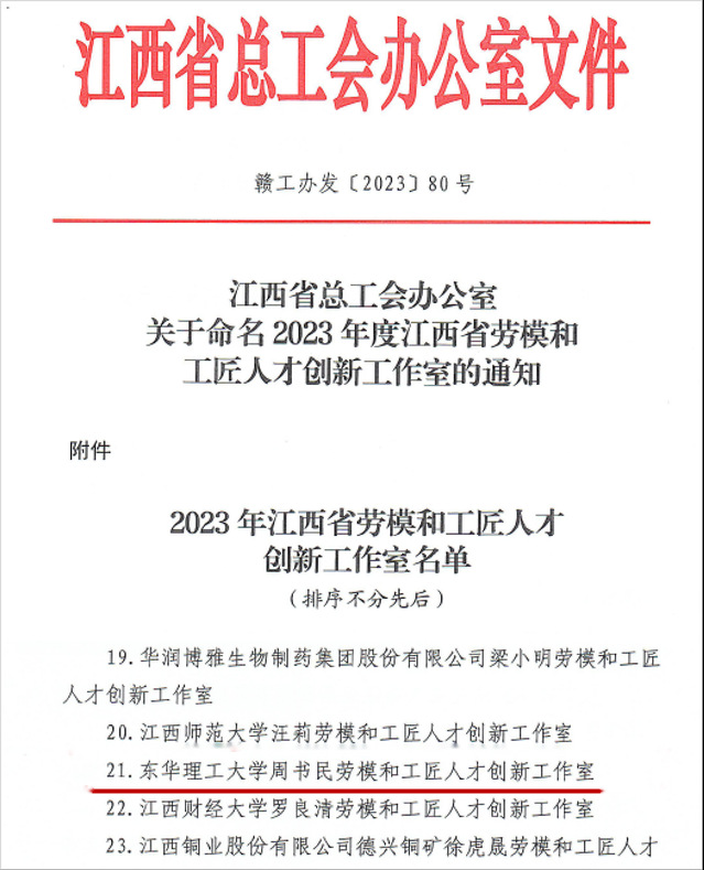 近日,省总工会公布了2023年度“江西省劳模和工匠人才创新工作室”名单,开云手机端·官方版在线周书民教授领衔的工作室成功获评“开云手机端·官方版在线周书民劳模和工匠人才创新工作室”称号,全省共有30个工作室获评。