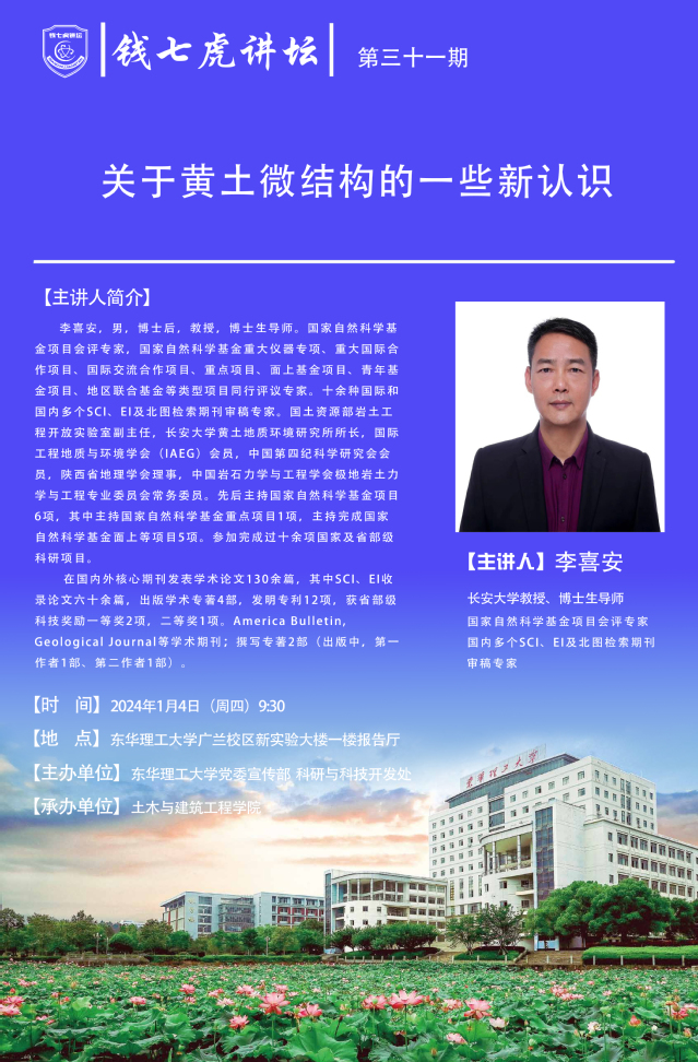 应土木与建筑工程学院邀请,长安大学教授,博士生导师李喜安来到“开云(中国)”,以“关于黄土微结构的一些新认识”为主题开展讲座。欢迎全校师生届时前往聆听。