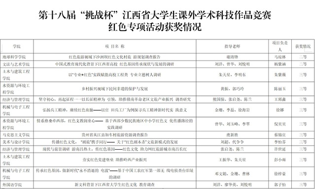 近日,共青团江西省委、江西省科学技术协会、江西省教育厅、江西省社会科学院、江西省学生联合会联合公布了第十八届“挑战杯”全国大学生课外学术科技作品竞赛红色专项活动省赛结果,开云手机端·官方版在线荣获二等奖2项、三等奖11项。